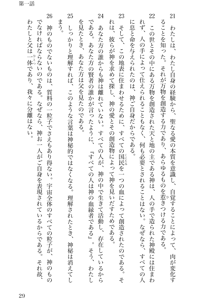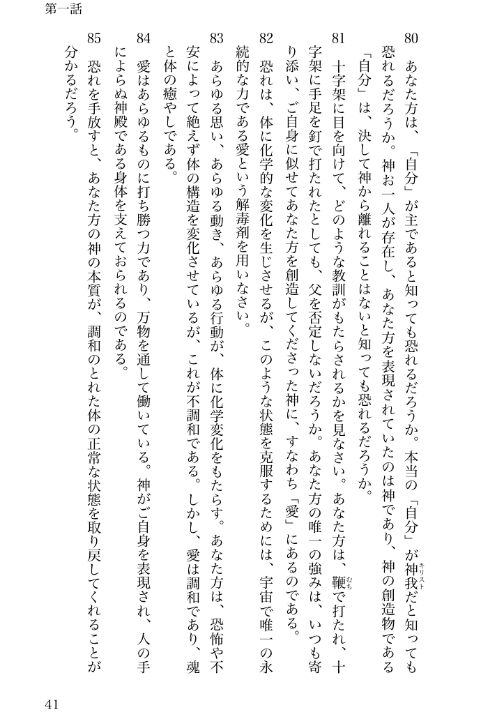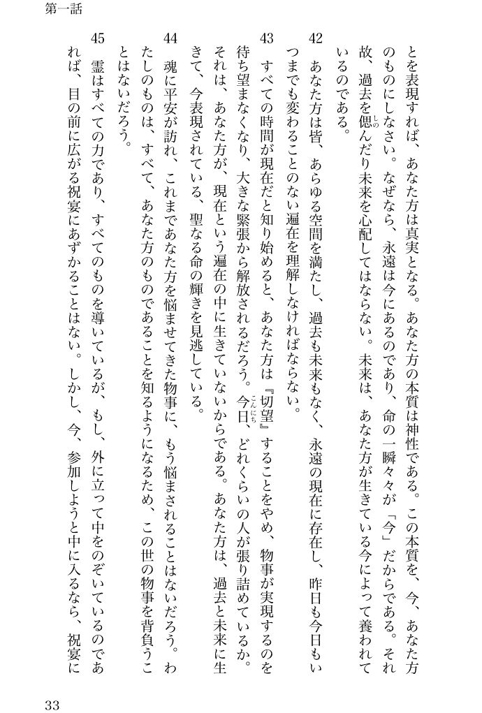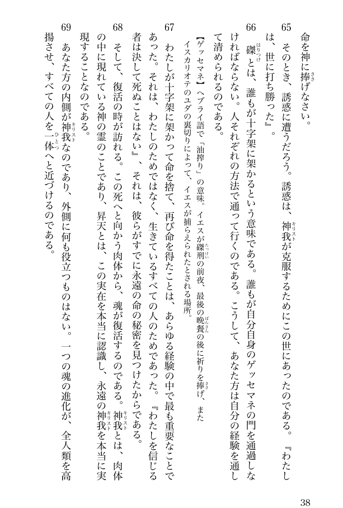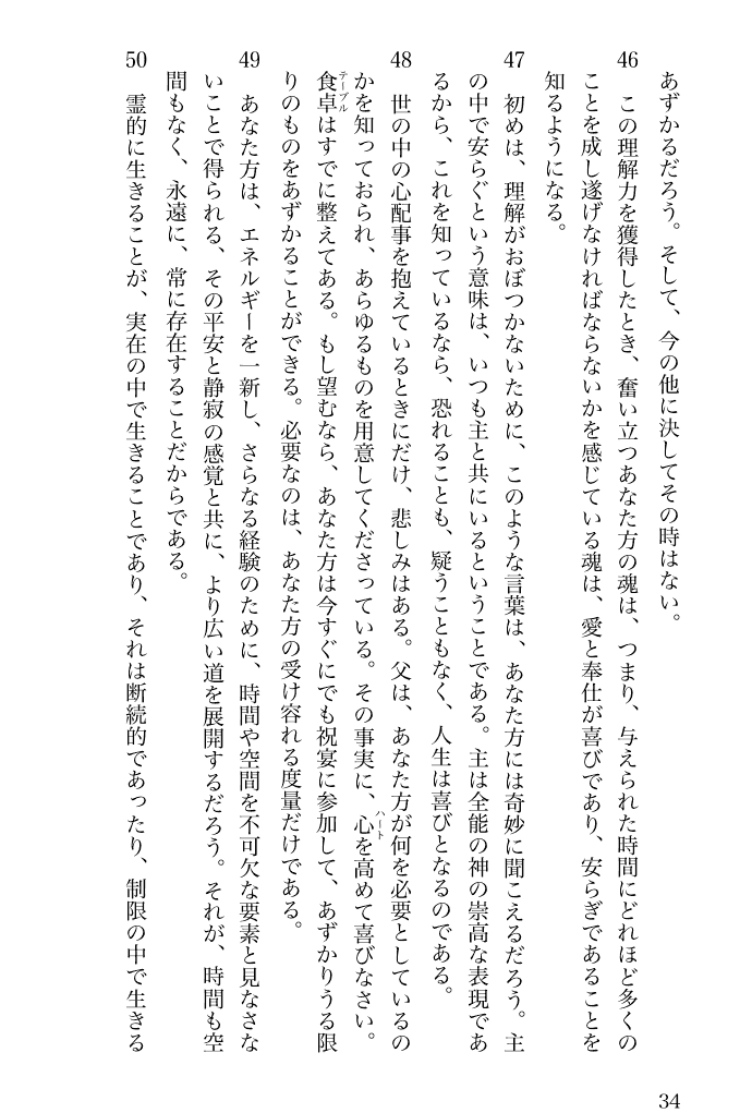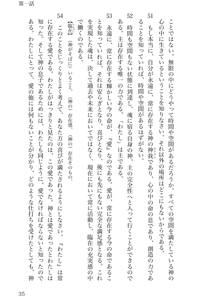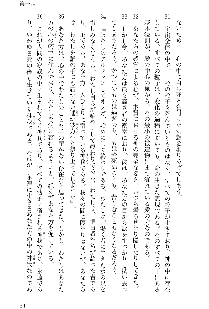 古風な格調高い雰囲気を残しつつ、言葉の奥に秘められたその深い真意が失われないように、原文に忠実でありながら、自然な日本語で表現しています。リズムや言葉の響きにも気を配り、力強く、愛深く、厳しくも気品のある美しい文章を目指しました。心静かに読み始めると、魅力的な音楽に心を奪われるように、霊的な感覚へと引き上げられてしまいませんか。