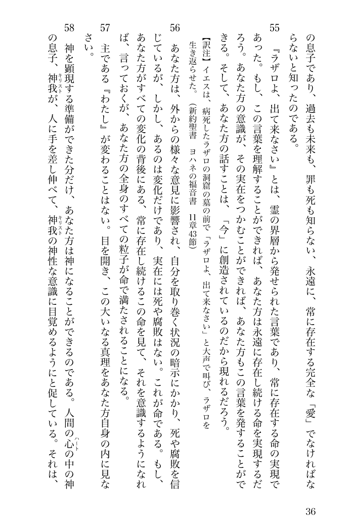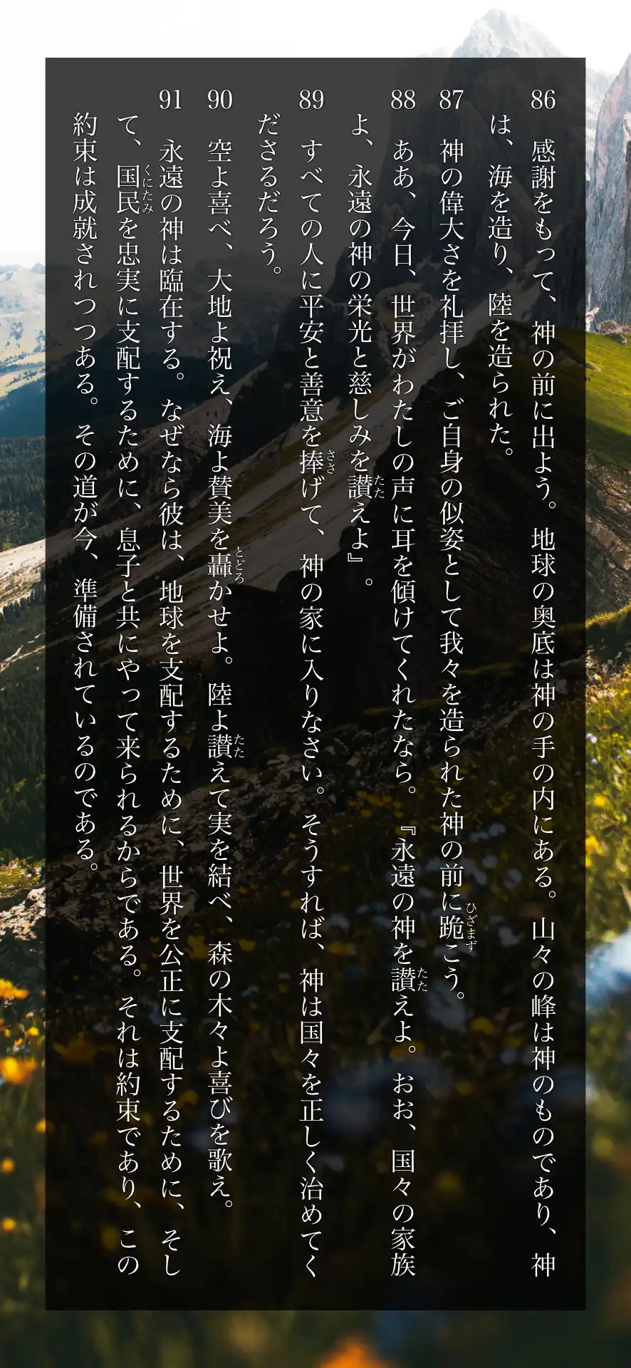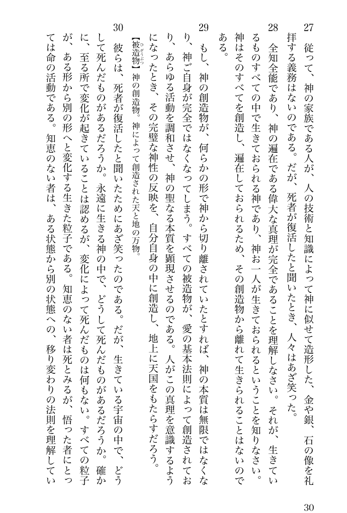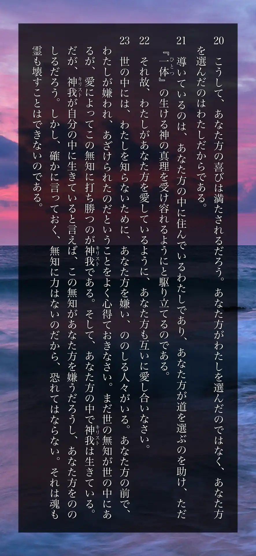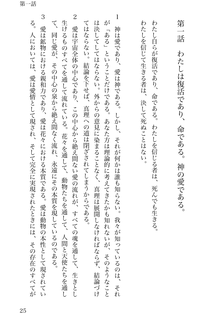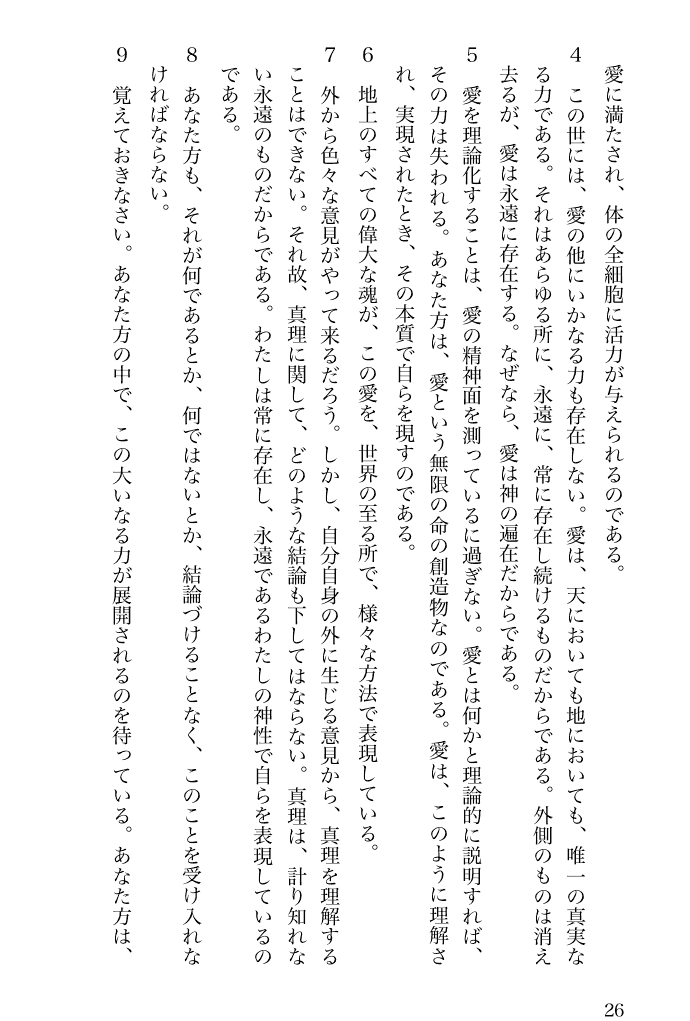 古風な格調高い雰囲気を残しつつ、言葉の奥に秘められたその深い真意が失われないように、原文に忠実でありながら、自然な日本語で表現しています。リズムや言葉の響きにも気を配り、力強く、愛深く、厳しくも気品のある美しい文章を目指しました。心静かに読み始めると、魅力的な音楽に心を奪われるように、霊的な感覚へと引き上げられてしまいませんか。