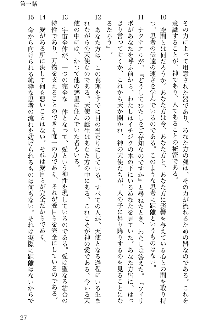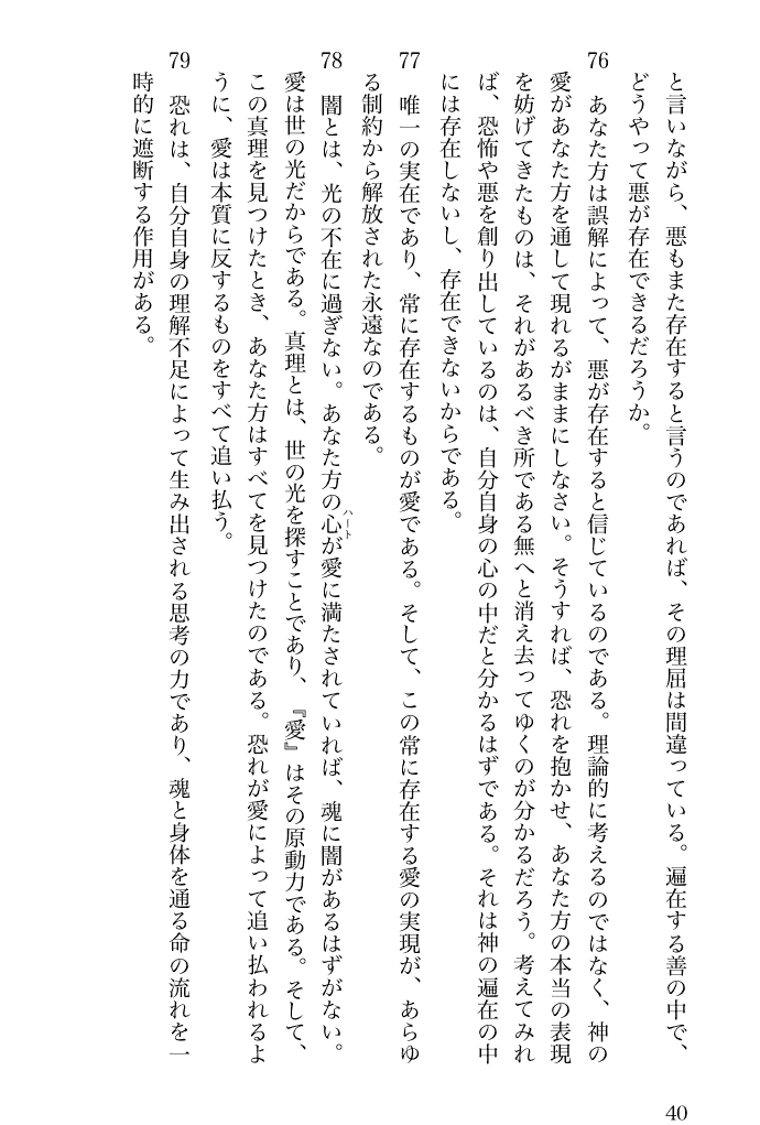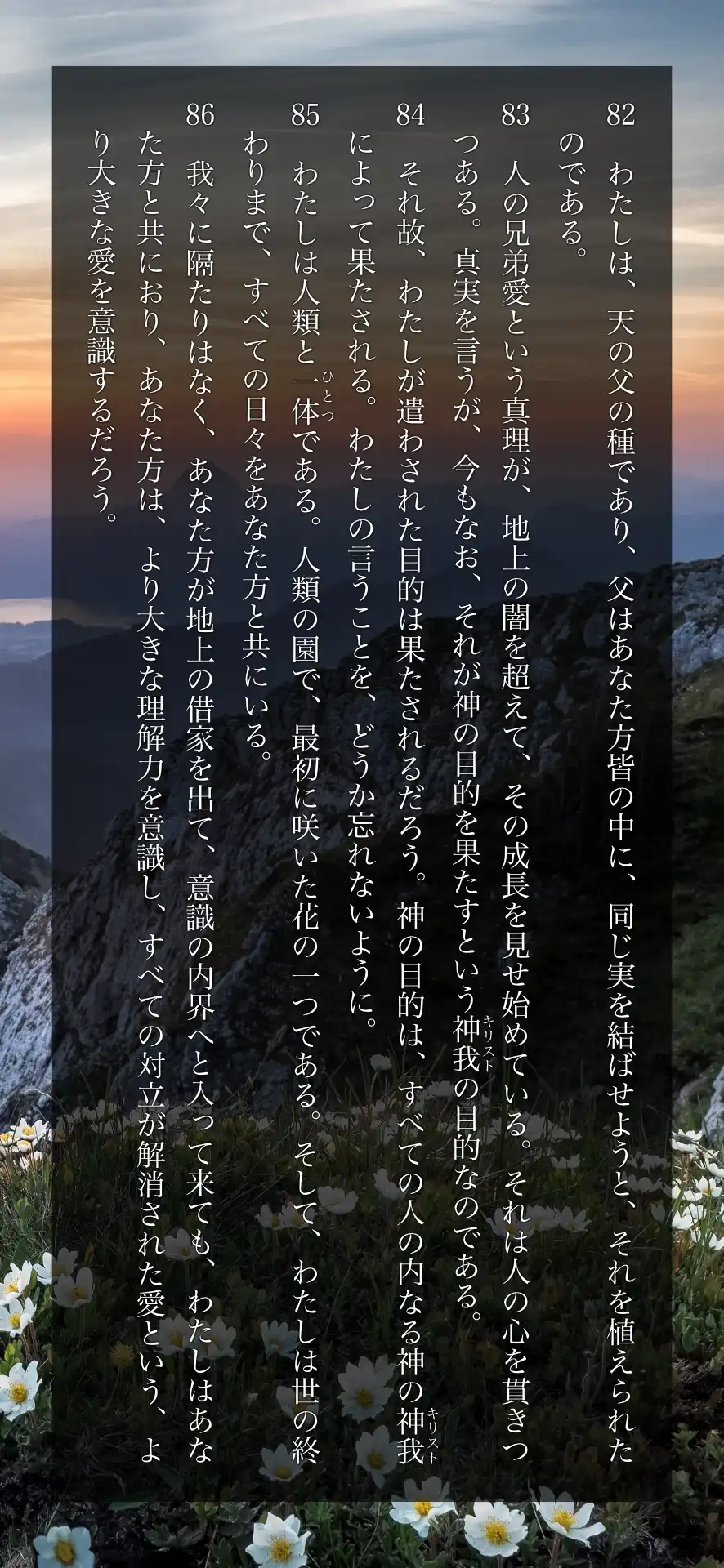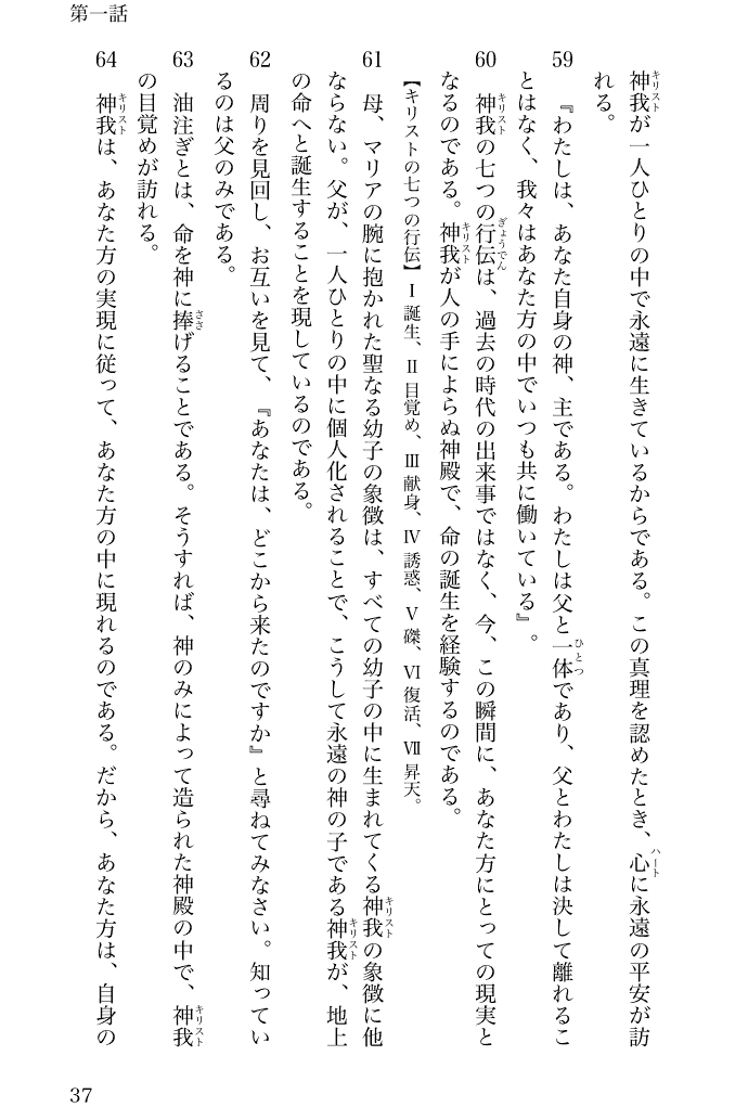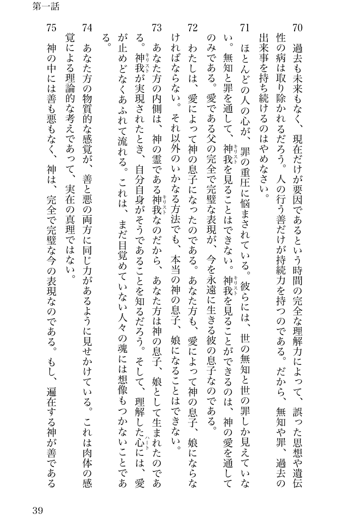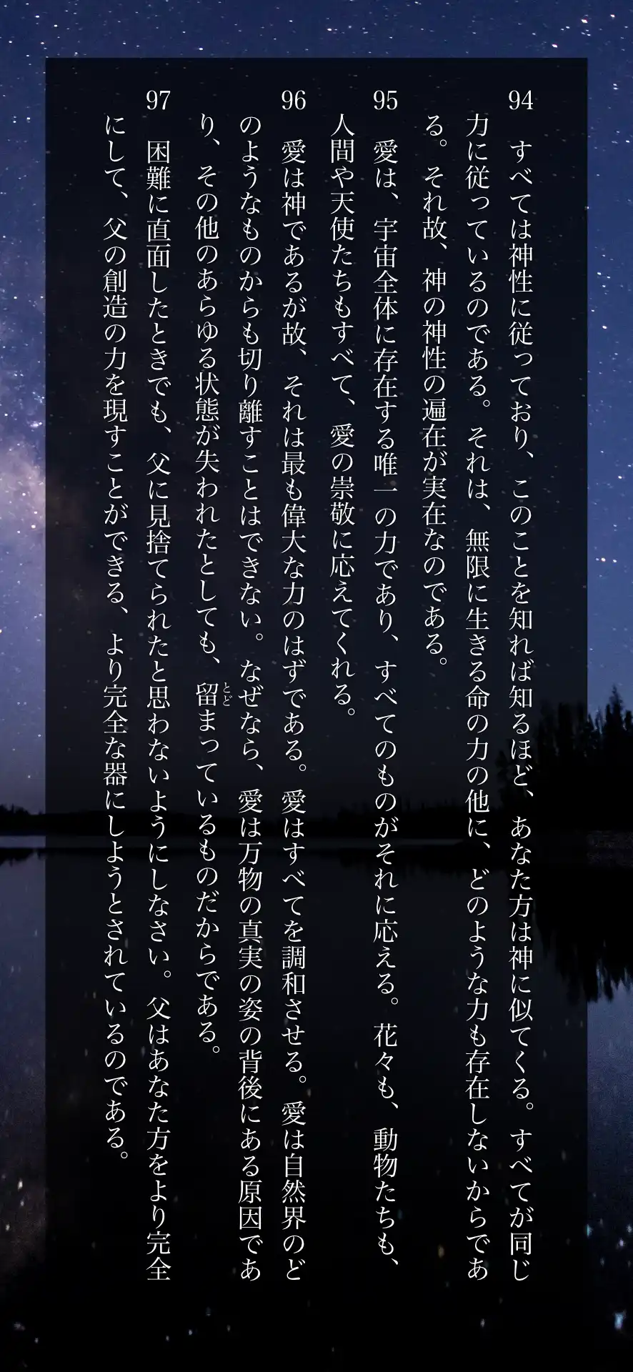 古風な格調高い雰囲気を残しつつ、言葉の奥に秘められたその深い真意が失われないように、原文に忠実でありながら、自然な日本語で表現しています。リズムや言葉の響きにも気を配り、力強く、愛深く、厳しくも気品のある美しい文章を目指しました。心静かに読み始めると、魅力的な音楽に心を奪われるように、霊的な感覚へと引き上げられてしまいませんか。